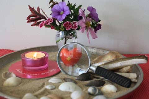 Op de roze placemat is een schaal gevuld met zand gezet.