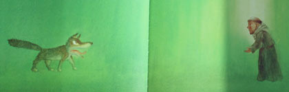Plotseling springt de grote wolf tevoorschijn.