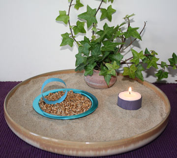* Zet op de kijktafel de blauwe ring, de kleur van vergeving en een symbool dat verwijst naar het laatste avondmaal. Bijvoorbeeld een bekertje of glas wijn, matzes of brood.