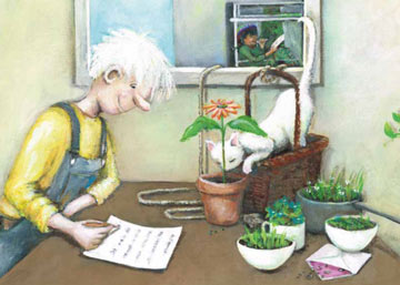 Zijn vrienden zien er schitterend uit, met hun rode, groene of blauw veren. Piet vind het erg jammer dat hij zo kaal is, terwijl hij zoveel van kleur houdt.