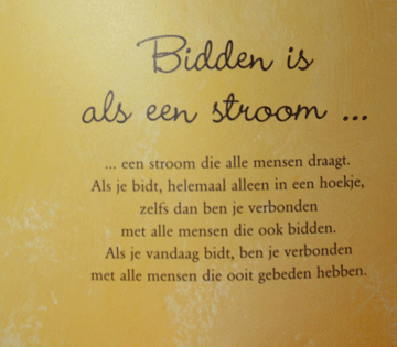 Dit is een afbeelding van een boekje over bidden, dat helaas niet meer verkrijgbaar is. Als je de pagina omslaat vertelt het boekje dat op het moment dat je bidt, je je voegt in die grote stroom gebeden van mensen. Mensen die nu elders op de wereld bidden, maar ook in de mensen die in het verleden baden of dat in de toekomst zullen doen. We maken als we bidden deel uit van een stroom...