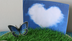In het zomerse decor staat nu een kaart met een afbeelding van een wolk in hartvorm samen met een vlindertje.