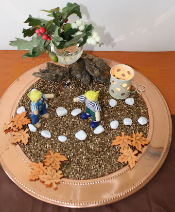 Met behulp van kleine kiezels kun je een pad maken op de herfstondergrond. Zet er twee poppetjes op en kleed de kijktafel verder in herfstsfeer aan. Ik gebruikte daarvoor kleine houten blaadjes, maar met 'echte' herfstbladeren wordt het natuurlijk nog mooier.