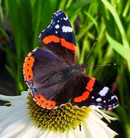 Deze zwart met oranje vlinder zie je het meest. Hij is groot, en zit bijna in alle tuinen. Hij heet Atalanta. Hij is erg mooi en heeft hemelsblauwe stukjes op het uiteinde van zijn vleugels.