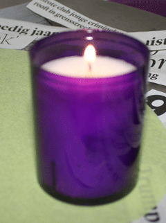 Zet aan de andere kant van het eiland een lichtje in een houder. Dit is het lichtje van de hoop. Ik koos voor de harmonie een paars houdertje, maar je kan ook een (paars) stompkaarsje of een eenvoudig glazen houdertje met een waxinelichtje gebruiken.