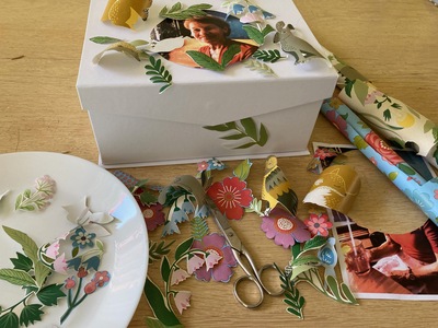 - Gedessineerd papier zoals cadeaupapier, découpage vellen, poëzieplaatjes, oude tijdschriften met mooie afbeeldingen, of geprinte foto(’s).